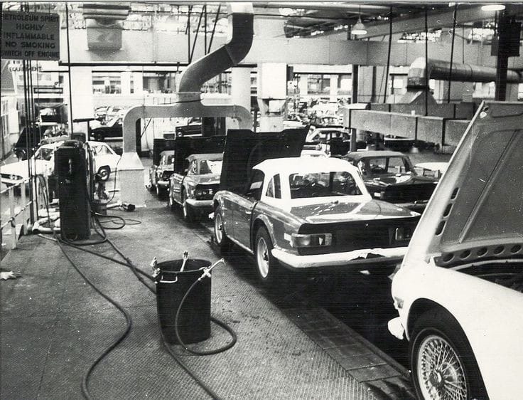 I have a weakness for the Triumph TR6 and this photo shows a batch of them progressing through the manufacturing process.